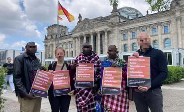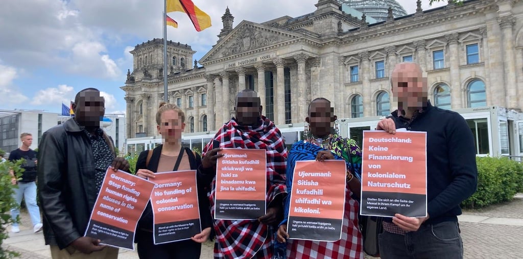 A Maasai delegation holds a demonstration in front of the German Parliament (Bundestag), demanding that funding which supports human rights violations be stopped. Credit: FIAN Deutschland.