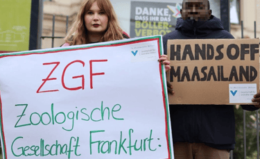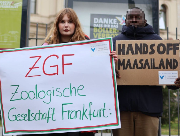 A MISA representative protests alongside CSOs in front of Frankfurt Zoological Society headquarters in Frankfurt in December 2023. Credit: MISA