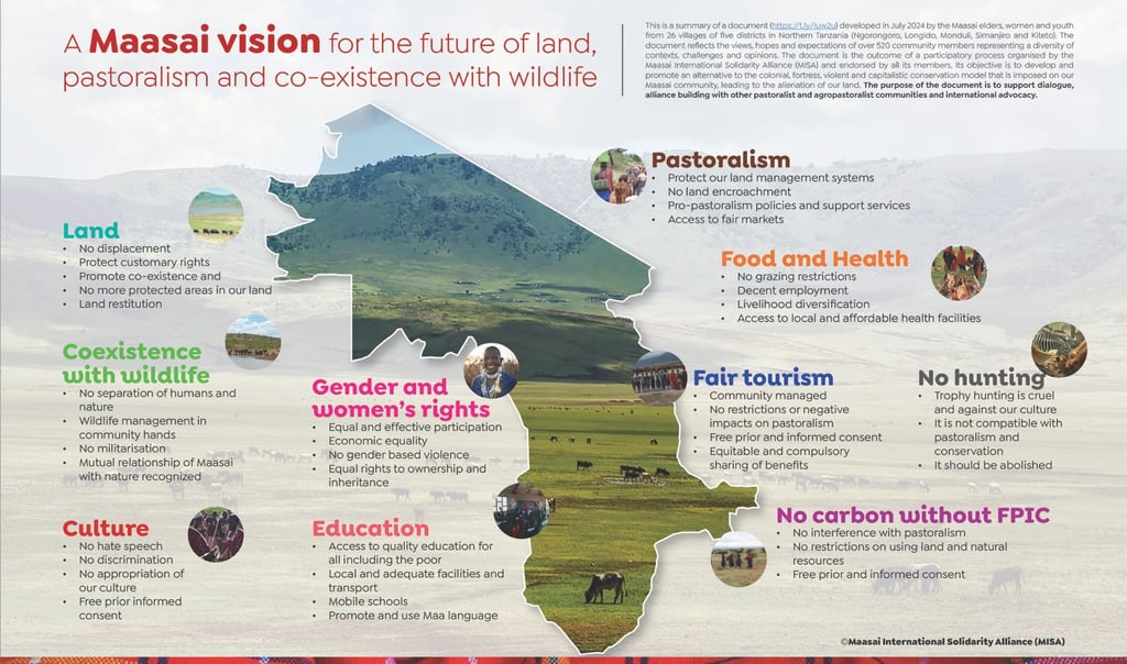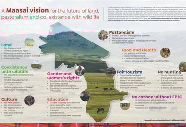 The document identifies not only challenges to this vision but also potential solutions. These challenges include negative stereotypes of the Maasai way of life, structural inequality, trophy hunting, unfair tourism practices and a lack of Free, Prior and Informed Consent (FPIC) in carbon credit negotiations.
